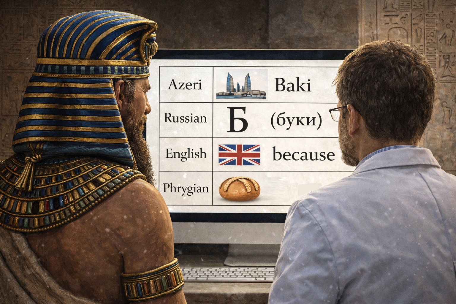 Египетский фараон Псамметих I решил выяснить, чей язык самый древний следующим образом: человеческие младенцы были помещены в стадо овец (или коз), людям было запрещено произносить любые слова в присутствии малышей. В результате дети выдали и продолжали лепетать слово «бекос», которое царь и его современники интерпретировали как слово «хлеб» на фригийском. Египтяне, считавшие себя древнейшим народом, признали, что фригийцы всё же старше их.